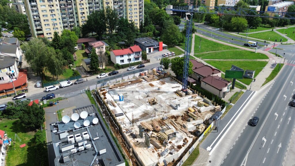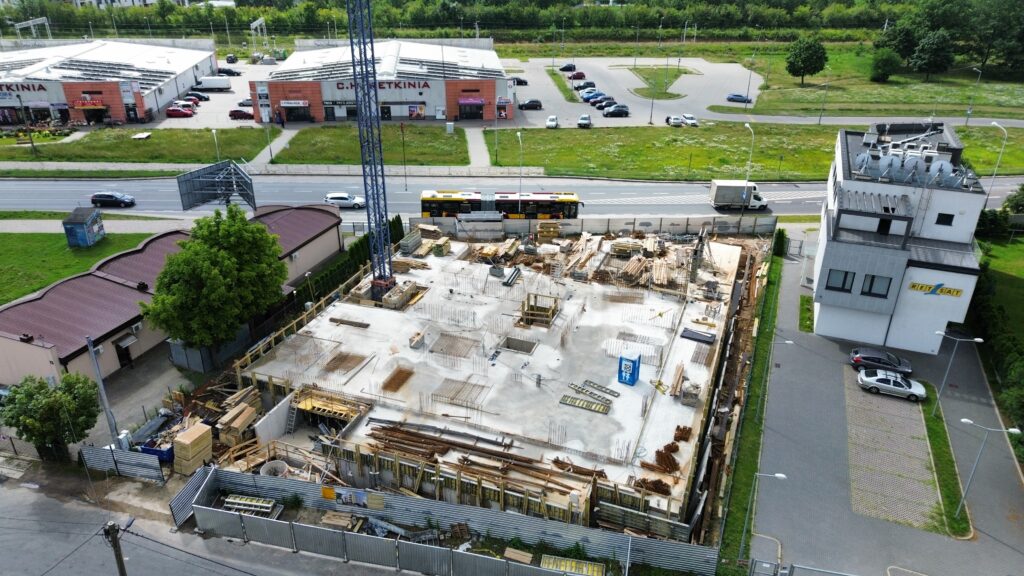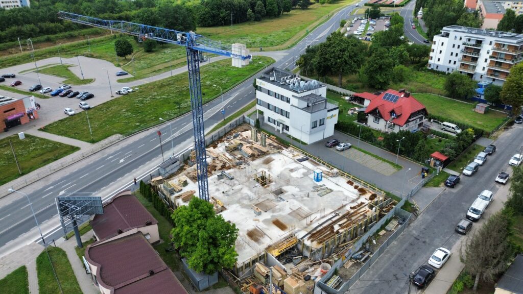 To ważny kamień milowy – na ten moment na placu budowy widać już ukończoną płytę fundamentową oraz pełną konstrukcję garażu podziemnego, wraz z przygotowanymi zbrojeniami pod kondygnację parteru.